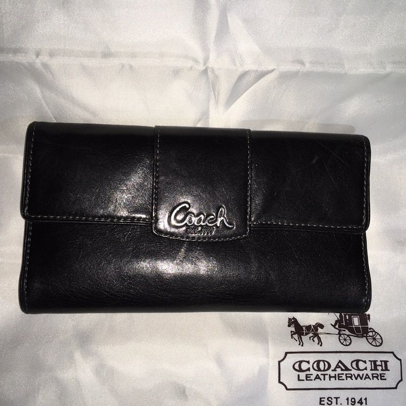 Genuine Coach wallet, full size tri-fold wallet. Black exterior with pink inside. Only used a few times. In "new" condition.