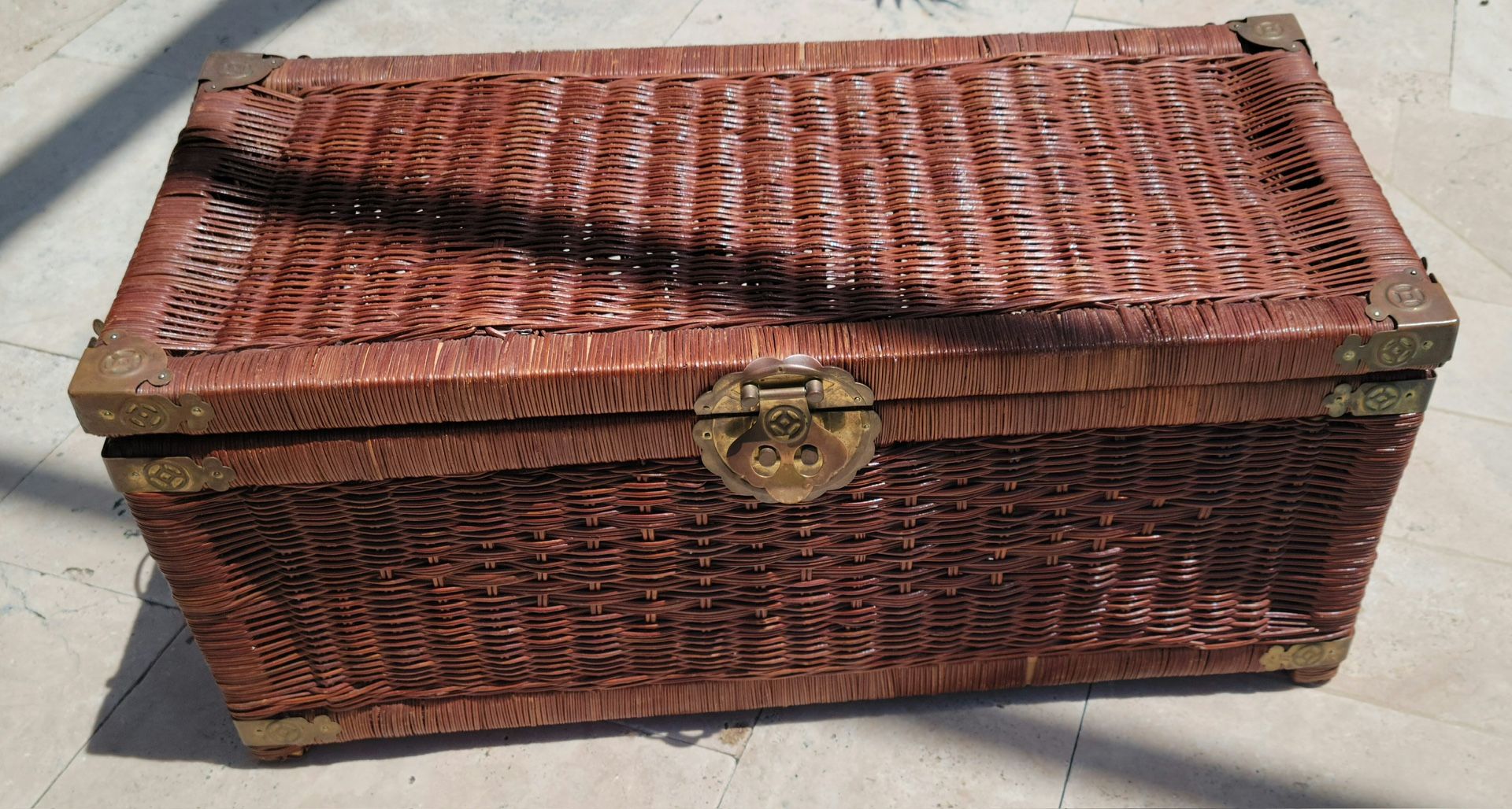 Vtg Chinoiserie Handwoven Wicker Trunk Blanket Chest Brass Hardware 28”X12.75"