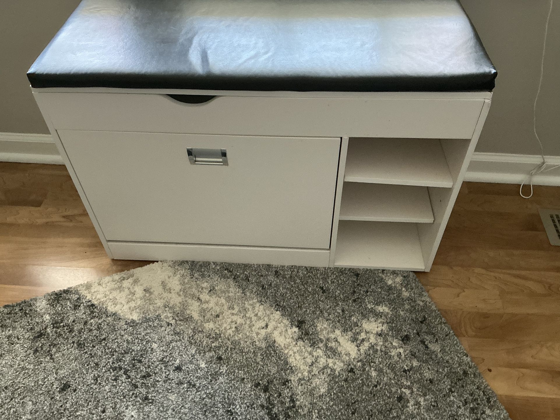 Shoe storage bench with padded seat. White. 31” 5/8 L x 13” 1/2 W x 21” H. Paid 129.99. From Corrigan Studios.