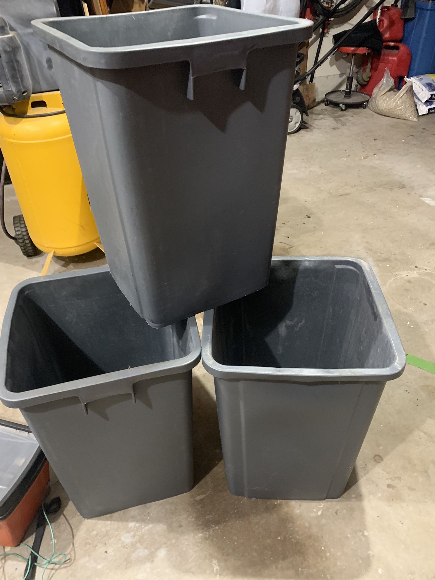 Three plastic thrash cans 21” tall 15 “ wide at the top 11” wide at the bottom! $5 dollars each!