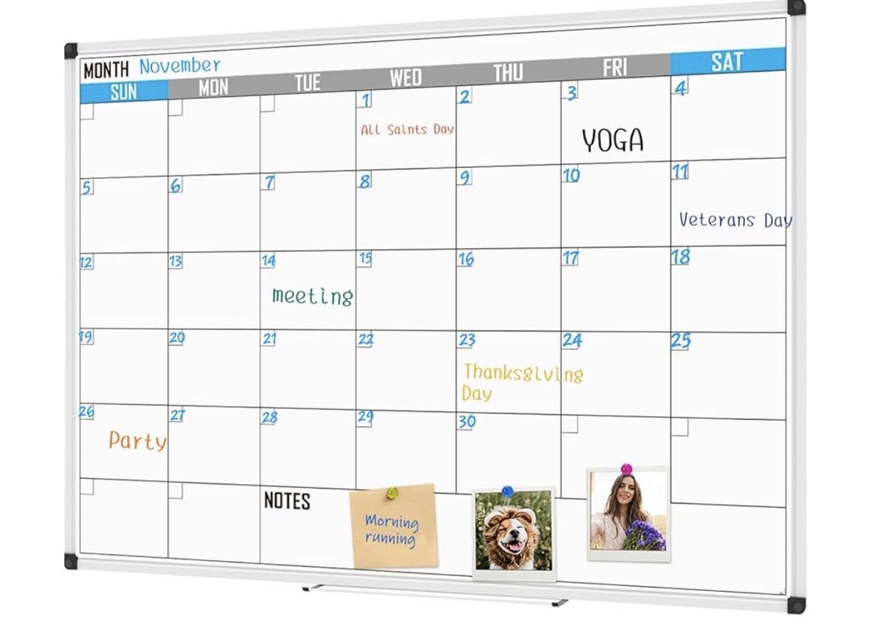 XBoard Magnetic Calendar Whiteboard 60" x 40" - Monthly Calendar Dry Erase Board, White Board + Colorful Calendar Board, Silver Aluminium Framed Monthly Planning Board Brand XBoard Color Silver Material Aluminum Recommended Uses For Product Office Mounting Type Wall Mount Product Dimensions 60"W x 40"H 【Multi-Use Whiteboard Calendar】XBoard monthly whiteboard can put your life in order, it is a good assistant to help you be a step ahead of your schedule. It Provides enough space to write down your to-dos and daily schedule, such as work projects. 【Upgraded Calendar Whiteboard】XBoard monthly whiteboard calendar has 6 lines instead of the 5 lines so that you can fill in your plan for the entire month, which ensuring that every day is included. The included pen tray could better hold your eraser and markers, keep your plan from being obscured. 【Smooth Writing & Easy to Wipe】Specially scratch-resistant surface lets all dry erase markers write smoothly and wipe clean easily, without ghosting or staining. XBoard has always been committed to providing you with an excellent writing experience! 【Unparalleled Quality and Reliable】Overall Size (frame included): 59.1" x 39.4", easy installation and maintenance. Crafted with a premium thick aluminum frame ensures stability and without warping or bending. 【Multi-scenario Widely Application】Ideal for use in a variety of settings including homes, schools, offices, game rooms, group teaching, kitchens, stores, dorms, and classroom environments. Great for learning activities, daily reminder and maintaining grocery lists. Brand Name XBoard Recommended Uses For Product Office Included Components Marker Tray, Mounting Hardware Target Audience Business Professional, Parent, Student, Teacher Manufacturer XBoard