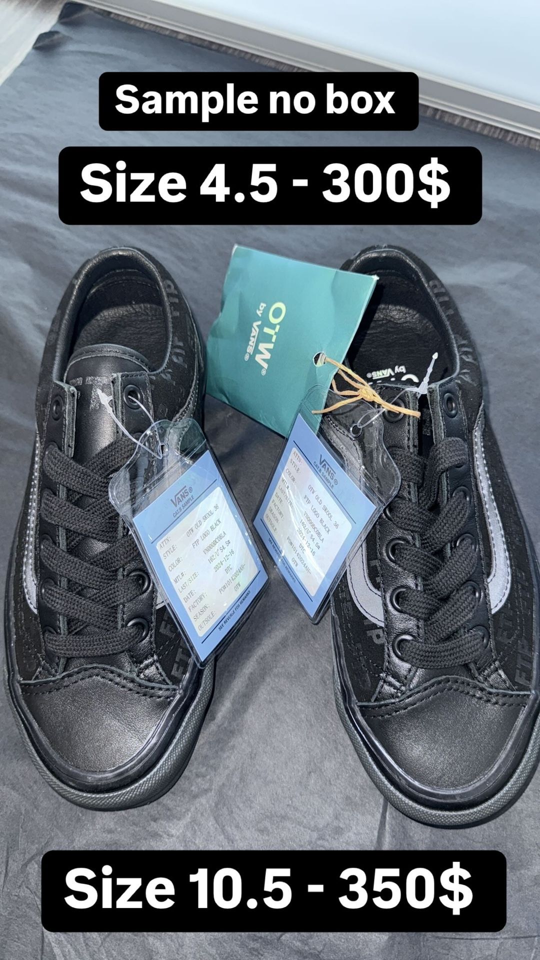 Brand new black pair 4.5 no box sample pair -300$ Brand new black pair 10.5 with box -350$ Brand new white pair 6.5 no box -250$ Brand new white pair with box size 9 - 260$ Brand new white pair no box size 11 -280$ If u have question lmk