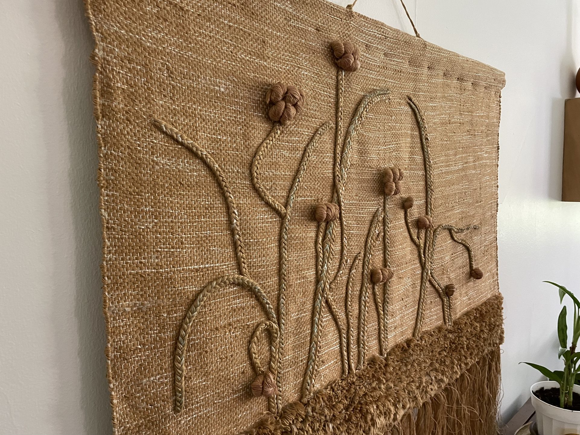 Handmade by a local artist macrame style wall art. I believe it’s made of yarn and burlap. It’s super cute and can have a boho / midcentury vibe. Super sturdy