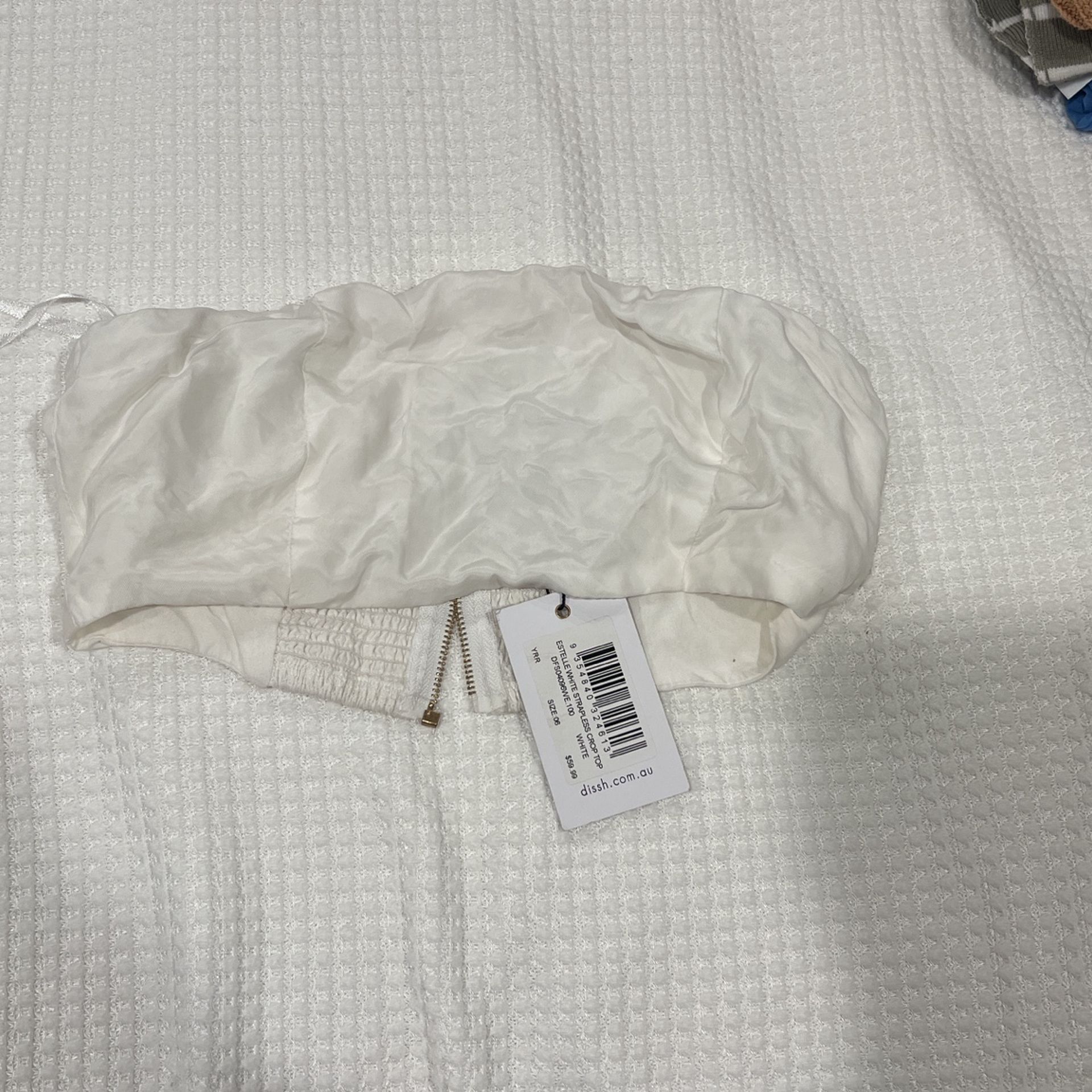 DISSH WHITE TUBE TOP. very gorgeous but zipper is messed up can be fixed. NEVER WORN.
