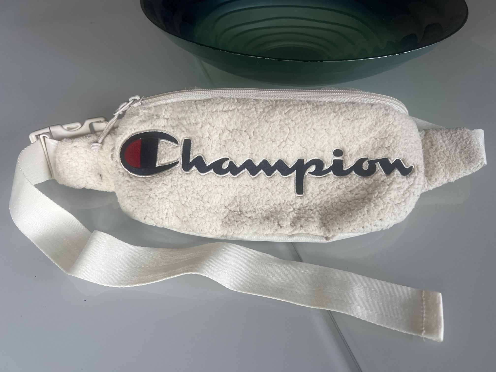 White Champion fanny pack with adjustable strap.