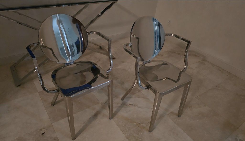 Set of 4 metal chairs Designer: Philippe Starck. Material: 80% stainless steel . versions. Finish: Mirror-polished for a reflective effect. Features: Includes integrated armrests that flow from the backrest to the front legs. Size: 17.5"W x 34.5"H x 18"D Seat Height: 17.5" Product Weight: 16.75 lbs Materials: Recycled Aluminum Country of Origin: United States Made in the USAMade in the USA