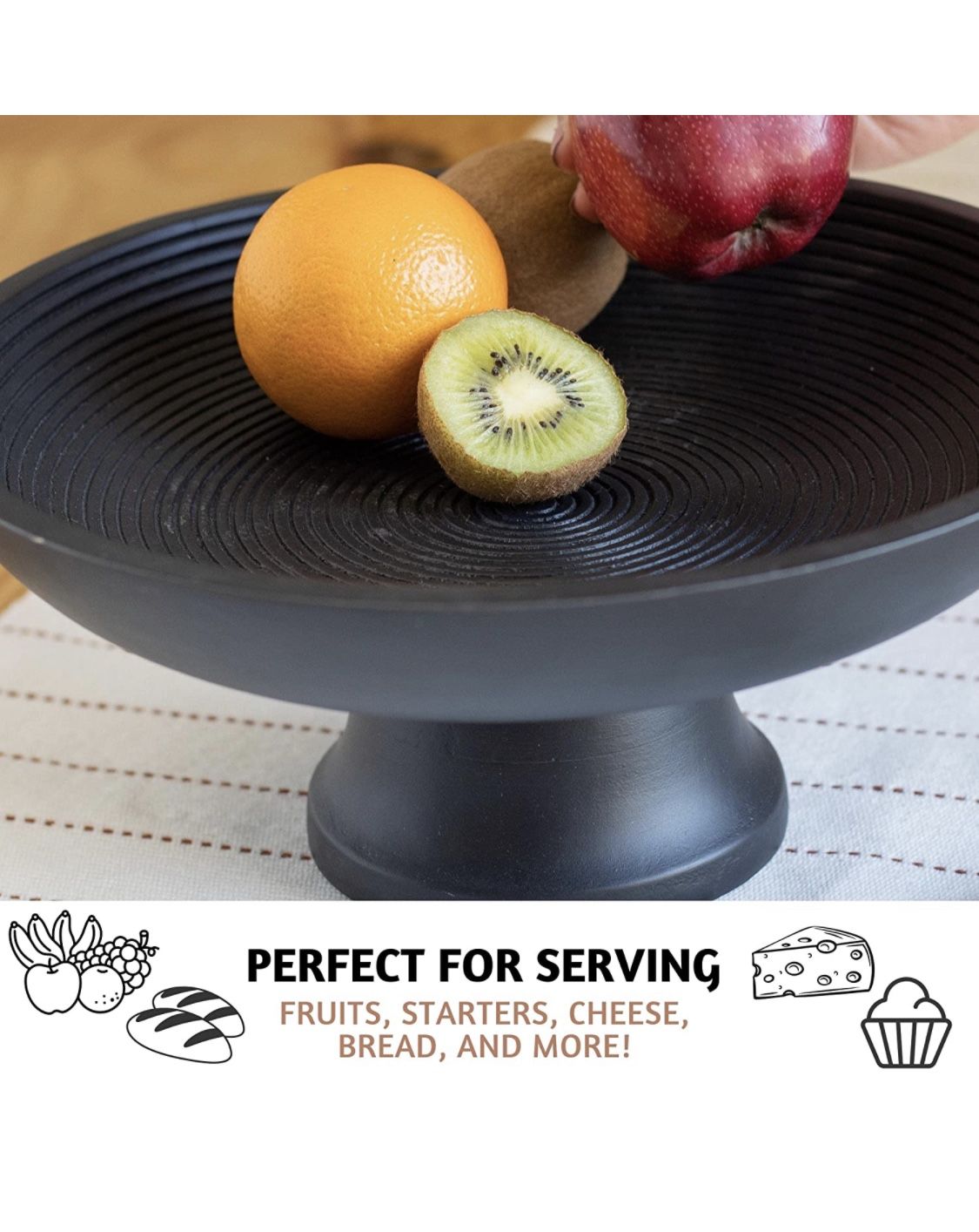 Amazon sells at $44.99 Perfect Fathers Day gift! Details Bowl Material Wood Number of Pieces 1 Brand Folkulture Color Black Ribbed Style Tableware About this item SIZE: 12 inch in diameter and 5 inch height, this black fruit bowl or footed bowl can accommodate a variety of healthy snack choices like fruits, vegetables, nuts, breads and even special treats like candy. This large fruit bowl is thus perfect for table tops and family gatherings. PREMIUM QUALITY: Not only does the natural mango wood give a good texture to the black decorative bowl but also makes this modern fruit bowl food safe, toxic free and healthy. This fruit bowl wood has an organic finish which makes it long lasting and rust free. UNIQUE DESIGN: Our black fruit bowl with ribbed detailing will end your search for the perfect christmas table centerpiece. It is designed to make a stylish accent piece for your kitchen countertop and dinnerware. VERSATILE KITCHEN HOME DÉCOR: The beautiful wooden black bowl can showcase a variety of small items and accessories. Use it as a potpourri bowl to spread pleasant fragrance or a candy bowl for kids, fill it up with glass stones and candles to use it as a stunning centerpiece. SAFE AND EASY TO CARE: Handwash this modern wooden fruit basket with warm soapy water, rinse and dry thoroughly with a clean cloth.