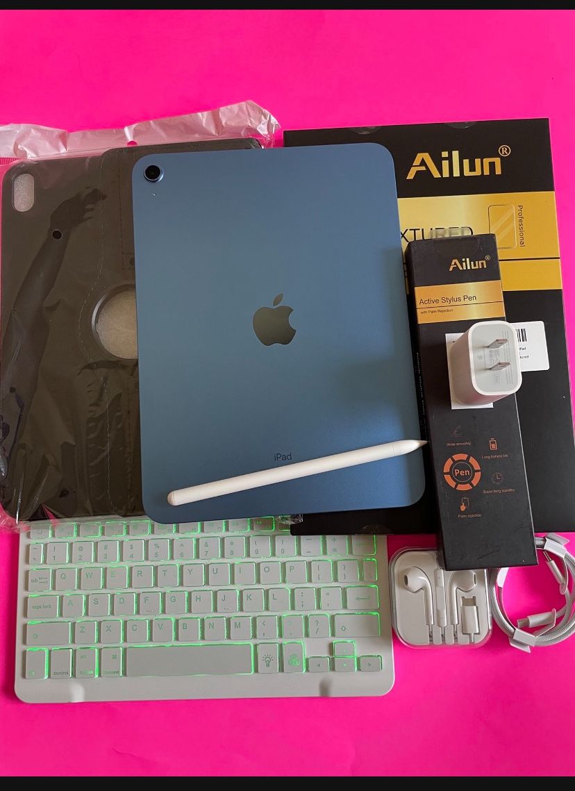 256gb Apple IPad 10th Generation (10.9” Liquid / 2022 model) with pen, keyboard, case & Accessories (warranty 2026)