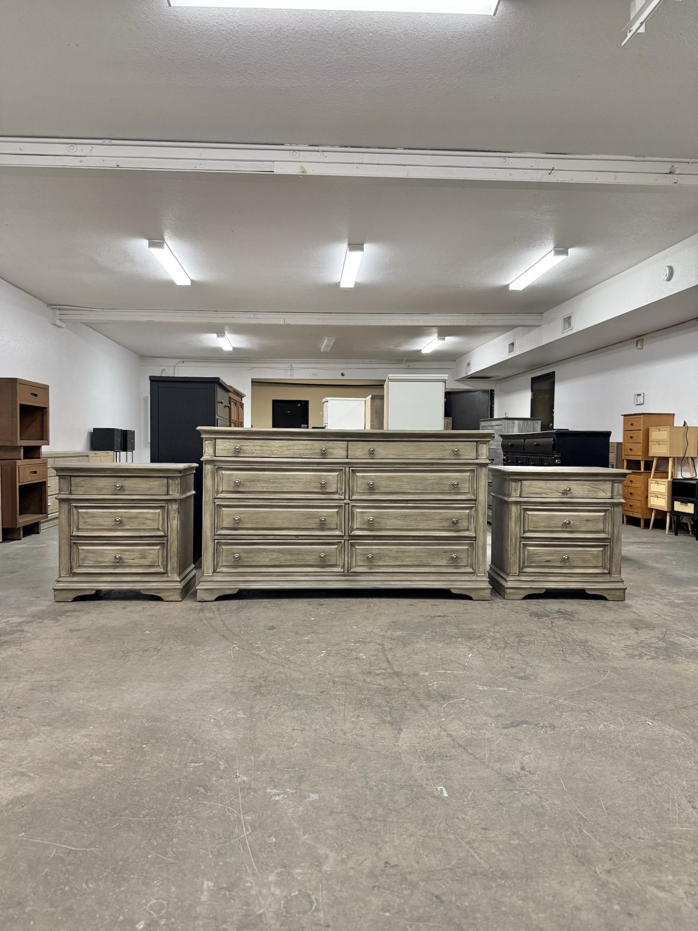 Dresser;65 long/38 tall/19 deep. Nightstands;28 long/29 tall/17 deep. Mark on top of dresser otherwise great shape. Check my page for more dressers and nightstands. Used & sold as is. Typical wear. All drawers work well. Exact cash, Zelle, or Venmo. We do not have change. First come first serve, no holds. Delivery for a fee based on cross streets or pick up Thomas Rd & the 51 highway. Disclaimer: This is used furniture and is sold as is. Discount Furniture LLC is not liable for any injuries or damages due to furniture use. Always secure the furniture to a wall and never let children climb or be left unattended. Wall anchors are not included in purchase. All sales are final no returns, exchanges, or warranty. Price includes sales tax.