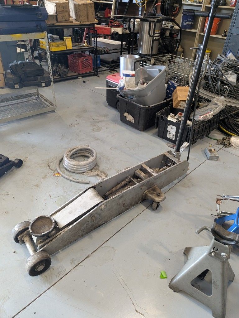 Heavy duty floor jack works both mechanically and pneumatically. Used to lift tractor trailers and other heavy duty equipment. Shoot me an offer because I'm cleaning out the shop and everything has got to go