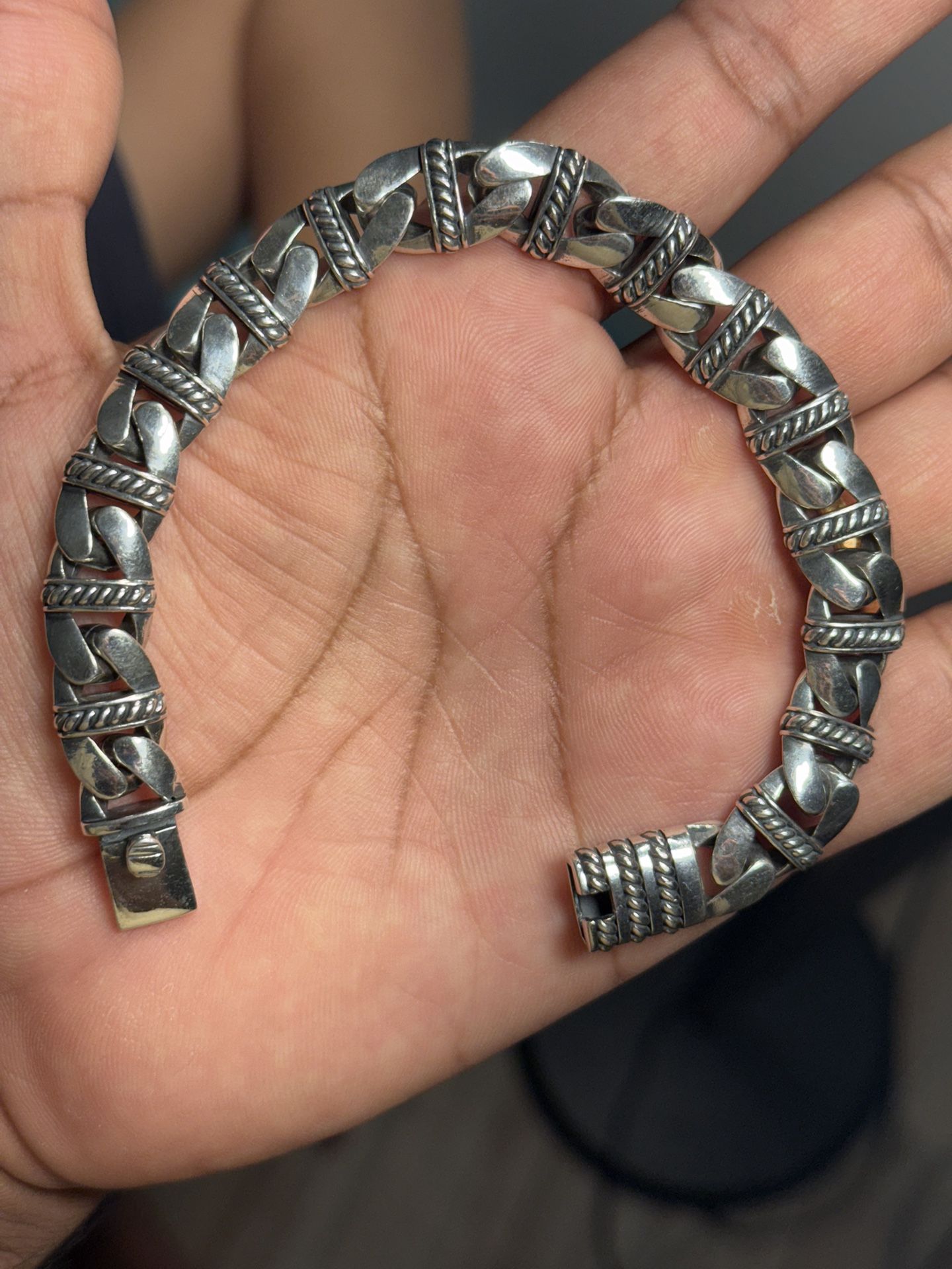 Handmade 925 sterling silver bracelet featuring a solid 10mm link design with detailed rope accents. This piece has an oxidized finish that gives it a bold, classic, and premium look. Item Details: • Material: 925 sterling silver • Length: 8.5 inches • Width: 10mm • Weight: 61 grams • Style: Solid handcrafted link bracelet • Finish: Oxidized antique style • Clasp: Secure box clasp • Gender: Men's / unisex • Condition: New This bracelet is heavy, durable, and made with high-quality craftsmanship. Ideal for everyday wear or gifting. Perfect for buyers looking for a solid, premium sterling silver piece.