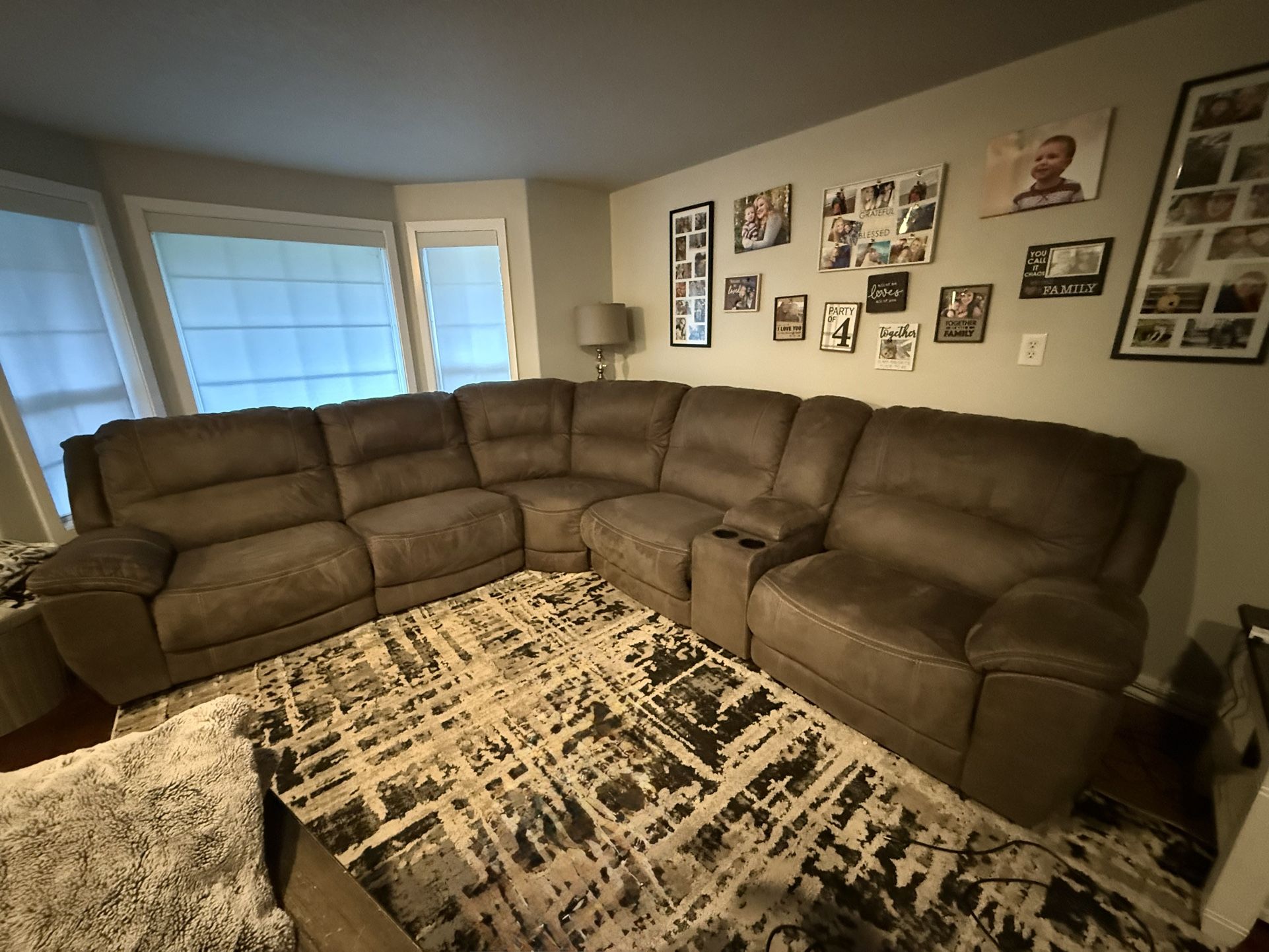Large recliner sectional! It’s a brownish color. 6 separate pieces including the cup holder. 12ftx10ft with the cup holder. 10x10 without. All pieces can be rearranged if you need it in more of an L shape. Very easy to wipe down and clean! We are a pet friendly home. Paid $3500 and asking 900 OBO. Bought about two years ago. Would love it gone today so offers will be accepted!!