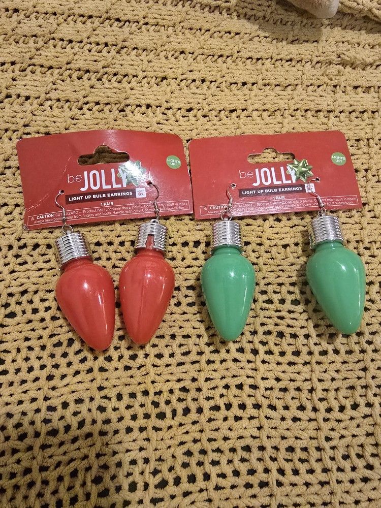 Brand New Never Worn 2 Available; Red & Green No Holds First Come First Serve Christmas Lightbulb Earrings $5 Each 3 Different Light Modes Disclaimer: I don't do refunds or exchanges. Items are sold "AS IS" working condition. Nuevos, sin usar 2 disponibles: rojo y verde Quien Llega Primero Se Lo Lleva Aretes navideños con bombilla $5 cada uno 3 modos de luz diferentes Aviso legal: No se aceptan devoluciones ni cambios. Los artículos se venden "tal cual", en perfecto estado de funcionamiento.