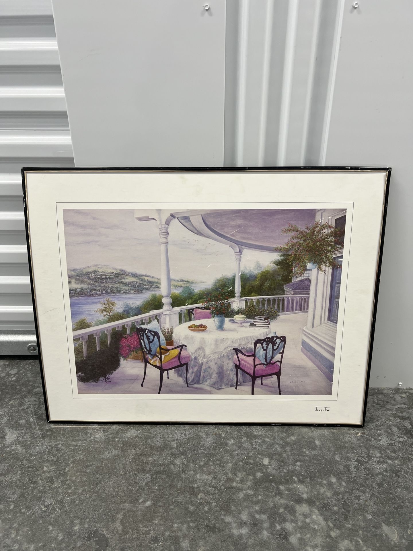 This is a framed art print titled "Vintage House Sea Scenery Wall Decor". It depicts a scene on a veranda or porch overlooking a body of water and hills.