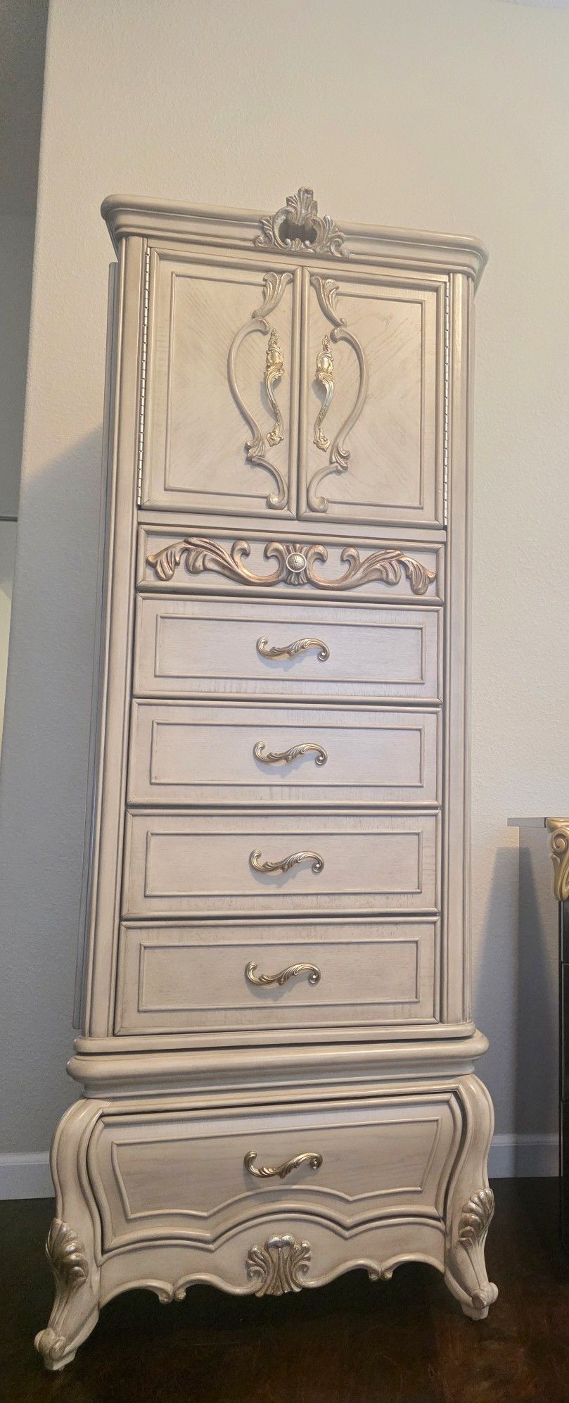 Beautiful Michael Amini × Jane Seymour (AICO) lingerie chest in ivory/pearl with gold accents. Stunning designer piece with elegant curves and carved details. high-quality. ✔ FEATURES: Designer AICO × Jane Seymour collection Ivory pearl finish with gold trim Multiple drawers with smooth glide Soft closing glides allowing for smooth operation Velvet lined jewelry caddy is included Chest swivels to full length mirror on the other side Modern Style Hollywood Regency / Glam style Dimension: 24"W x 19"D x 68"H ✔ CONDITION: Good condition. No major scratches, chips, or damage. Smoke-free, clean home. ✔ PRICE: $960 OBO Cash only Pickup only — bring help. This piece is heavy.