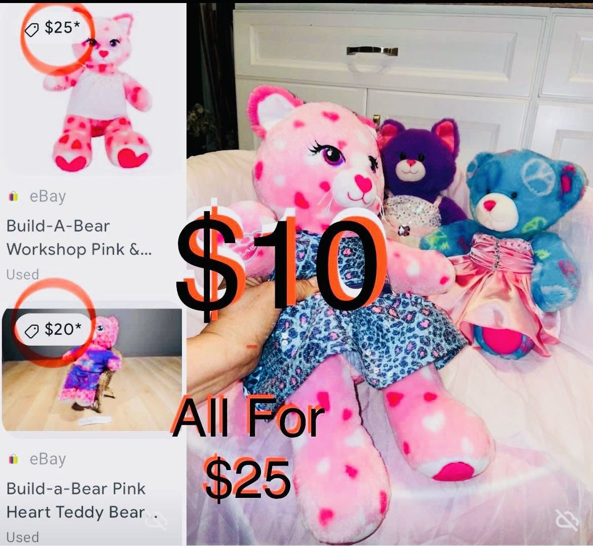 $10 Each or All for $25 Build A Bear Workshop Cat with Hearts 💕 Peace sing Blue Bear & Purple Cat