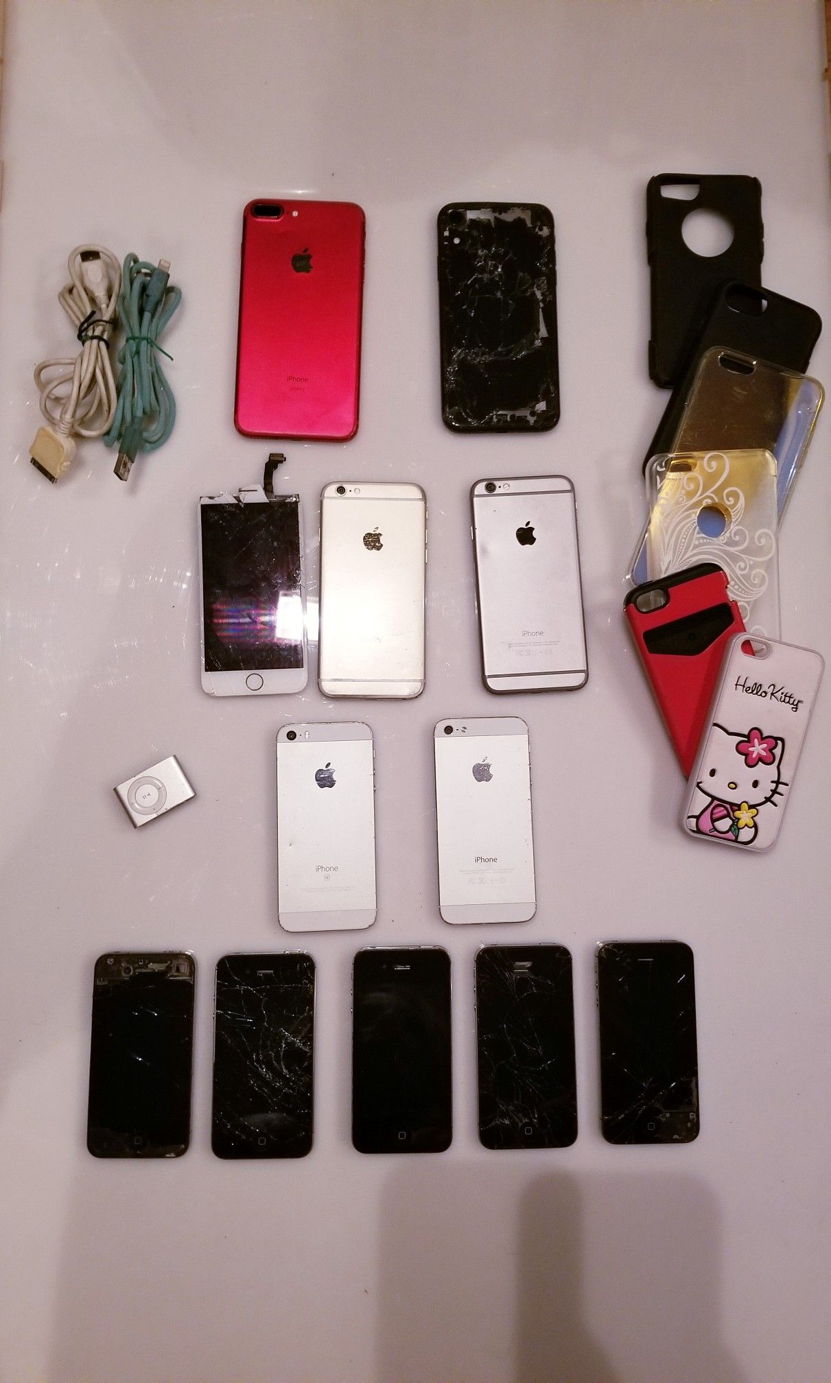 Selling lot of iPhones for parts or u can fix them . Also comes with accessories (4) iphone 4 (1) iphone 5 (I )iphone se (2) iphone 6 (1) iphone 7 plus red (I) iphone xr (1) ipod shuffle (2) charging cables (6) various iphone cases Please dont ask a million questions. Selling as is. Most power on. One of them is ready to use. I'm also throwing in a working ipod shuffle seen in last two pics. Prefer to sell all together but might consider selling individually....please make offer