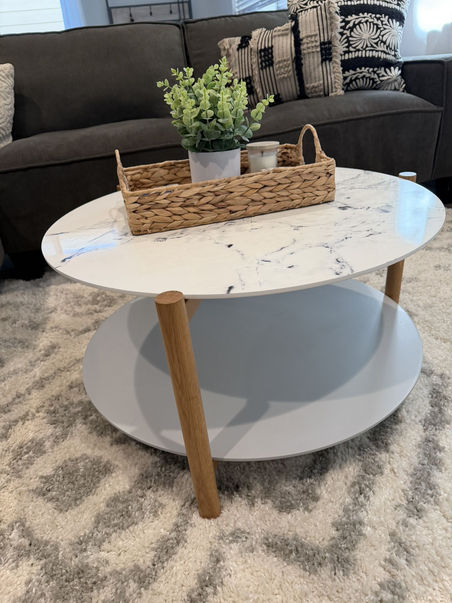 round coffee table from Pier 1, white faux "marble" top and grey base, like new condition