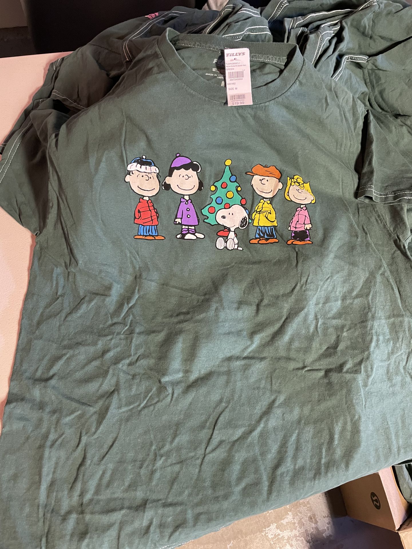 Snoopy Peanuts Christmas t shirts for sale. They are brand new but have minor defects such as small holes or stain but are brand new from factory as defects. They have no issues with wearability. But price is cheap because of the minor defects. They are great gifts to friends and family. Color is green and the sizes in the lot are: 31 medium, 28 large, 4 xl, 1 2xl 64 t shirts for $50 very good price.