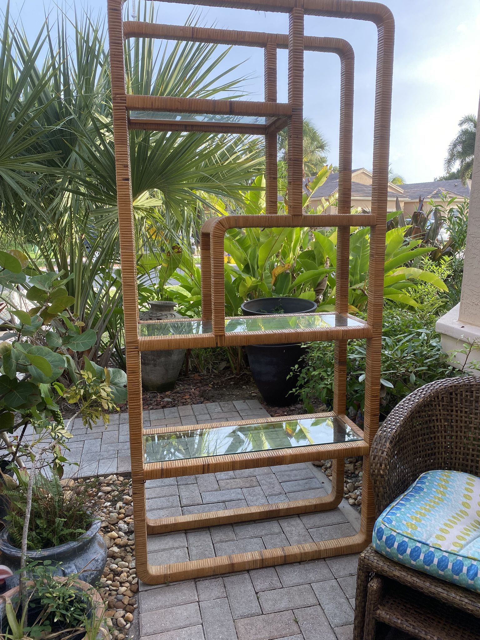Rattan wrapped wood framing with clear glass shelves. Overall in good condition. Glass, Rattan. Height: 78 in (198.12 cm) Width: 36 in (91.44 cm) Depth: 14 in (35.56 cm). Mid-Century Modern