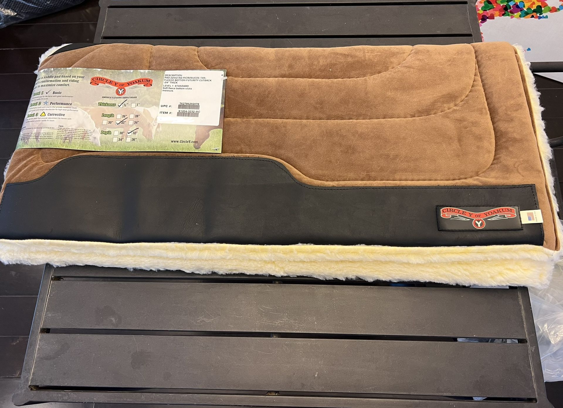 Circle Y of Yoakam horse saddle pad DESCRIPTION: PAD-32X32 SQ-MICROSUEDE-TAN FLEECE BOTTOM-FUTURITY CUTBACK -3/4" THICK LEVEL 1 STANDARD Soft fleece bottom wicks moisture. (contact info removed)78 UPC #: ITEM #: X1(contact info removed)-MC