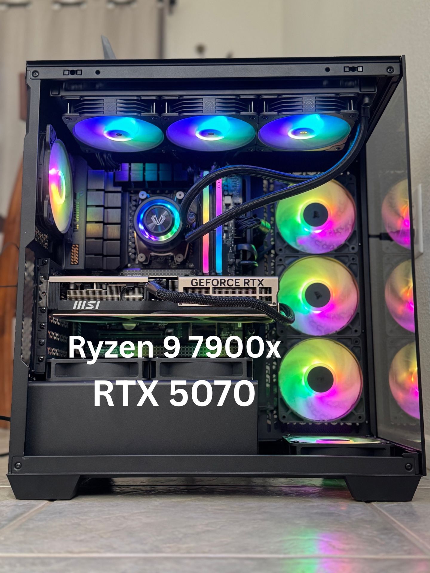 • Runs Fortnite, Valorant, Apex Legends, and Call of Duty at 400+ FPS • Local Delivery Available • Money Back Guarantee – Try it out, risk-free! • Biweekly 0% financing available Specs: CPU: AMD Ryzen 9 7900X 12-Core Processor GPU: MSI RTX 5070 Inspire 3X 12 GB OC Video Card CPU Cooler: Vetroo Lurker II R360 ARGB Liquid Cooler Motherboard: ASUS TUF Gaming B650-Plus WiFi ATX Memory: TEAMGROUP T-Force Delta RGB 32 GB (2 x 16 GB) DDR5-6000 Storage: AGI AI818-43 2 TB NVMe M.2 PCIe 4.0 Solid State Drive Power Supply: ABS Cyclops CS1000M 1000W 80+ Gold Fully Modular Case: Corsair 3500X RS-R ARGB Cooling: • 3x Vetroo 120mm ARGB (AIO) • 1x ABS 120mm ARGB • 6x Corsair RS120-R 120mm ARGB Reverse Total: 10 ARGB Fans OS: Windows 11 (Activated) Average Tested FPS (1080p High/Ultra): Fortnite – 400+ FPS (Performance Mode) Valorant – 500+ FPS Apex Legends – 340+ FPS Call of Duty Warzone – 300+ FPS Overwatch 2 – 450+ FPS GTA V, Hogwarts Legacy, Spider-Man, and more – 150–180+ FPS High-performance gaming system with strong airflow and premium RGB setup. Ready to go – plug n play! Tags: Fortnite PC Valorant PC Call of Duty PC Apex Legends PC Warzone PC 240Hz Gaming 360Hz Gaming Esports PC VR Ready Streaming PC Editing PC Corsair NZXT ASUS MSI Gigabyte ASRock Lian Li Thermalright Deepcool Cooler Master Razer EVGA PowerColor XFX Intel i9 i7 i5 i3 Intel 14th Gen Intel 13th Gen Intel Ultra Ryzen 9 Ryzen 7 Ryzen 5 Ryzen 7000 Ryzen X3D Gaming CPU RTX 5090 RTX 5080 RTX 5070 Ti RTX 5070 RTX 5060 RTX 4060 Ti RTX 4060 RTX 4070 RTX 4070 Super RTX 4080 RX 7900 XTX RX 7900 XT RX 7900 GRE RX 7800 XT RX 6950 XT RX 6800 XT
