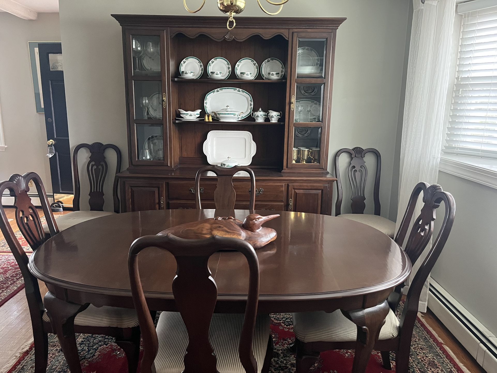 Six chairs, Queen Anne style, 84 inches long oval table with leaves and pads, cabinet with three open shelves, four cabinets and theee drawers.