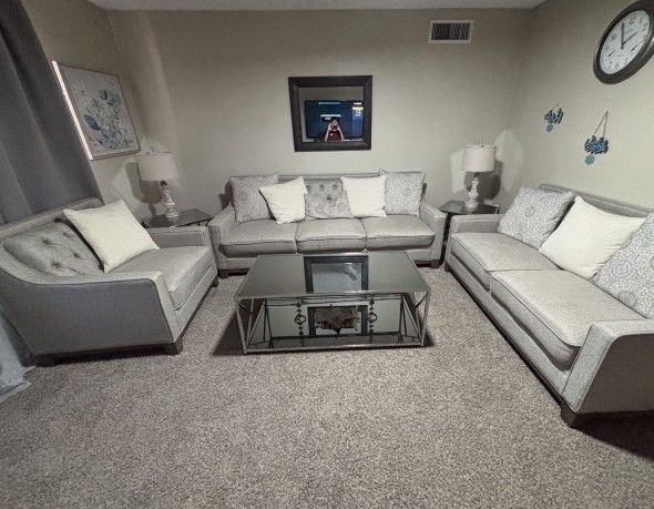 Gray living room set for sale, can sit 6 people easily. In excellent condition, almost like new, nothing wrong with it, no stains or rips. Ask $900 OBO.