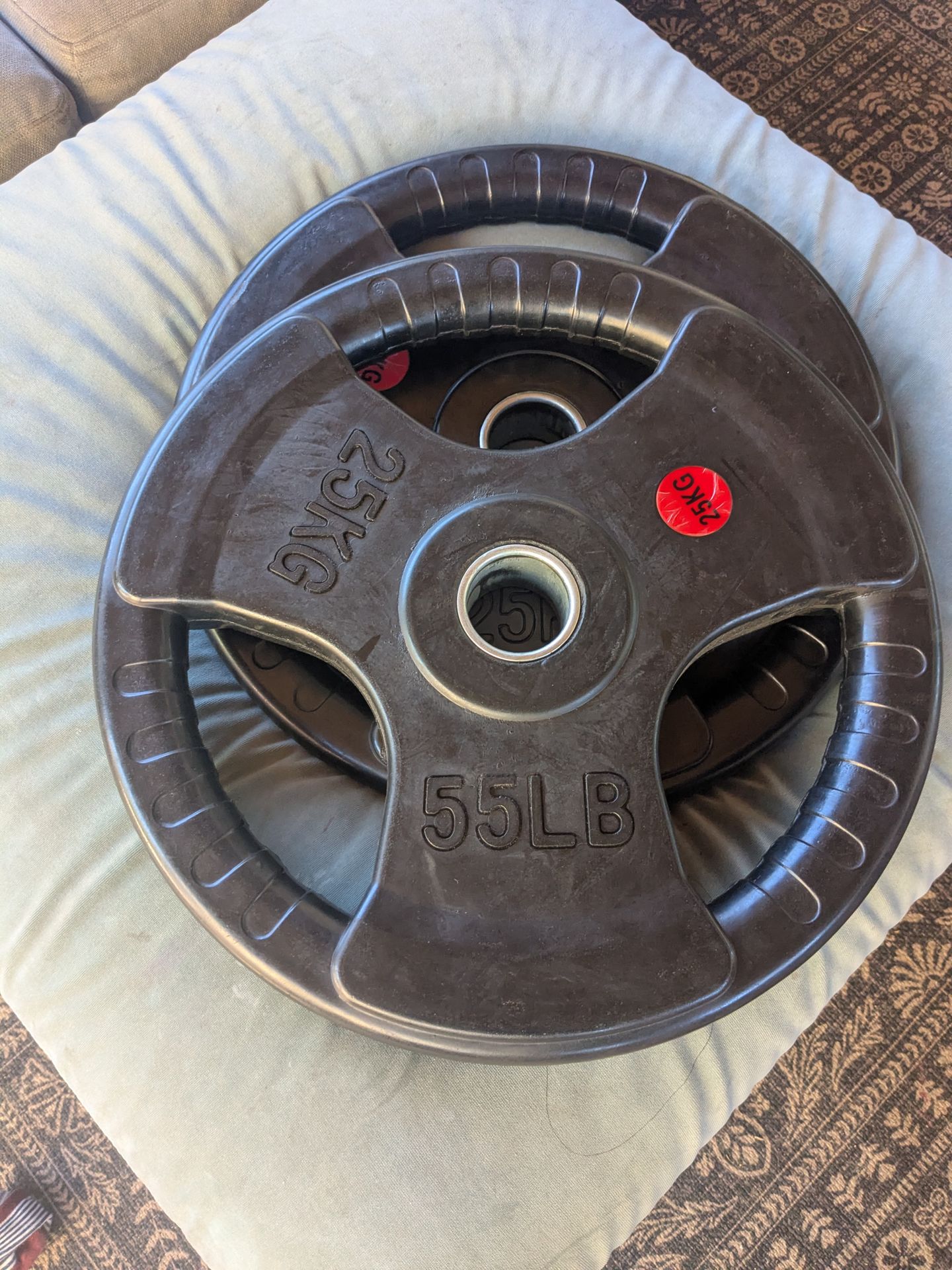 Used but in good condition. Pair of 55 lb/ 25kg Olympic weight plates.