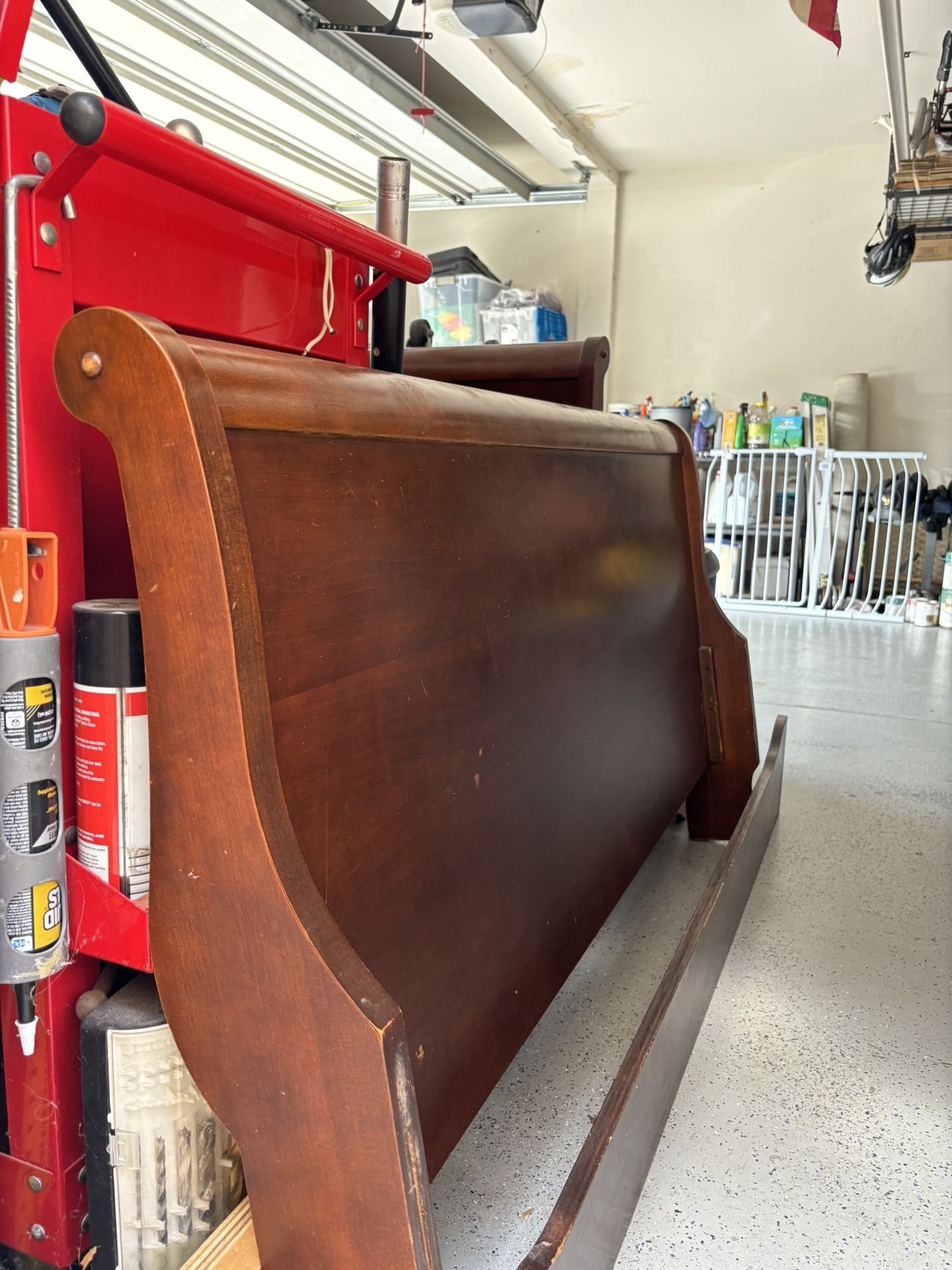 This wood sleigh bed comes with head board, foot board and running boards. No mattress or box spring . In good condition just used