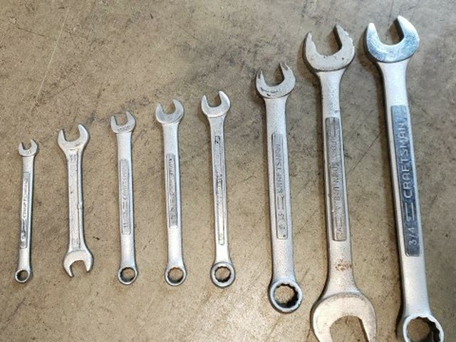Lot of 3/4 in. Craftsman Combination Wrench + Craftsman combo -V- Open End Wrench Forged In USA + 9/16 in. Craftsman Combination Wrench + Great Neck Combination Wrench metric 10mm x 10mm + 3/8 in. Craftsman Combination Wrench + 11/32 in. Craftsman Combination Wrench + Open End Wrench metric 10mm x 11mm + 1/4 in. Craftsman Combination Wrench