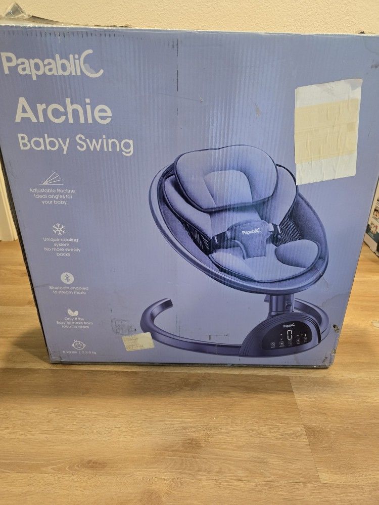 Gray Papablic Archie Baby Swing. 12 soothing songs, 5 distinct speeds, 3 soft toys with canopy. Powered by AC Adaptor or batteries with Remote control.