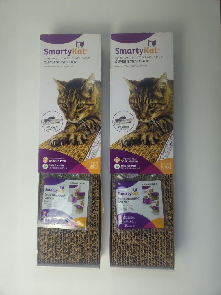 2 SMARTYKAT corrugated cat scratchers with catnip (new in box). Approximately 4.75 by 18 inches. It can be used flat or folded into an angled scratcher, giving your cat options for comfort and stretching.