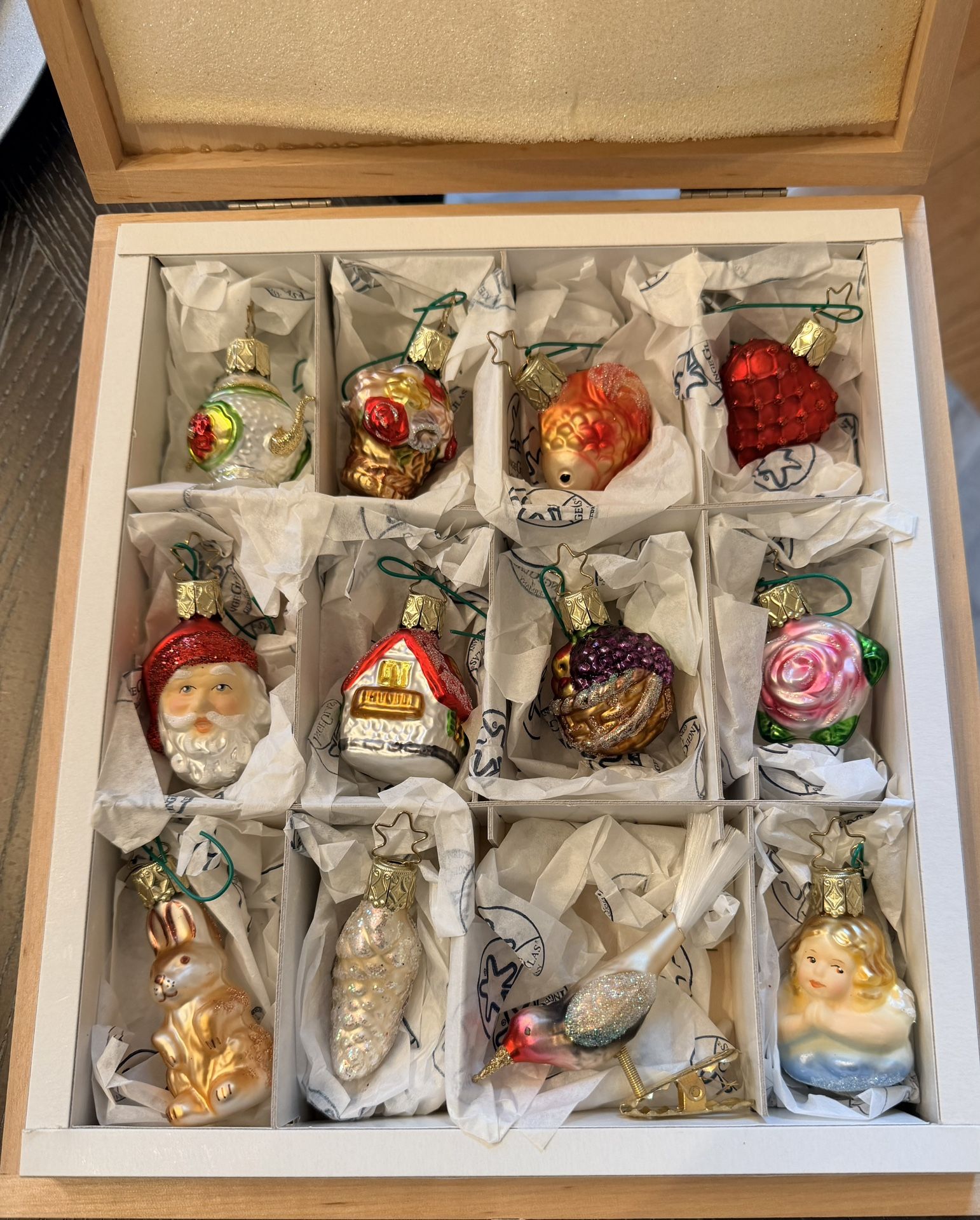 Wooden boxed set of 12 glass Christmas tree ornaments Approx 2in each Wedding ornament collection