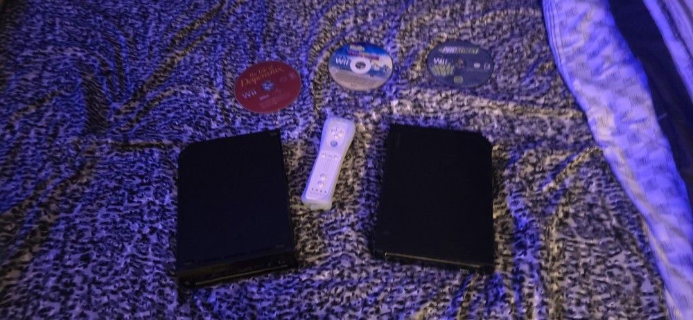 2 wii 1 og model and 1 model 2 Only comes with 1 ac adapter 1 av cable 1 wiimote after market and 3 games SpongeBob plankton robotic revenge Need for speed pro street Tales of desperaux.
