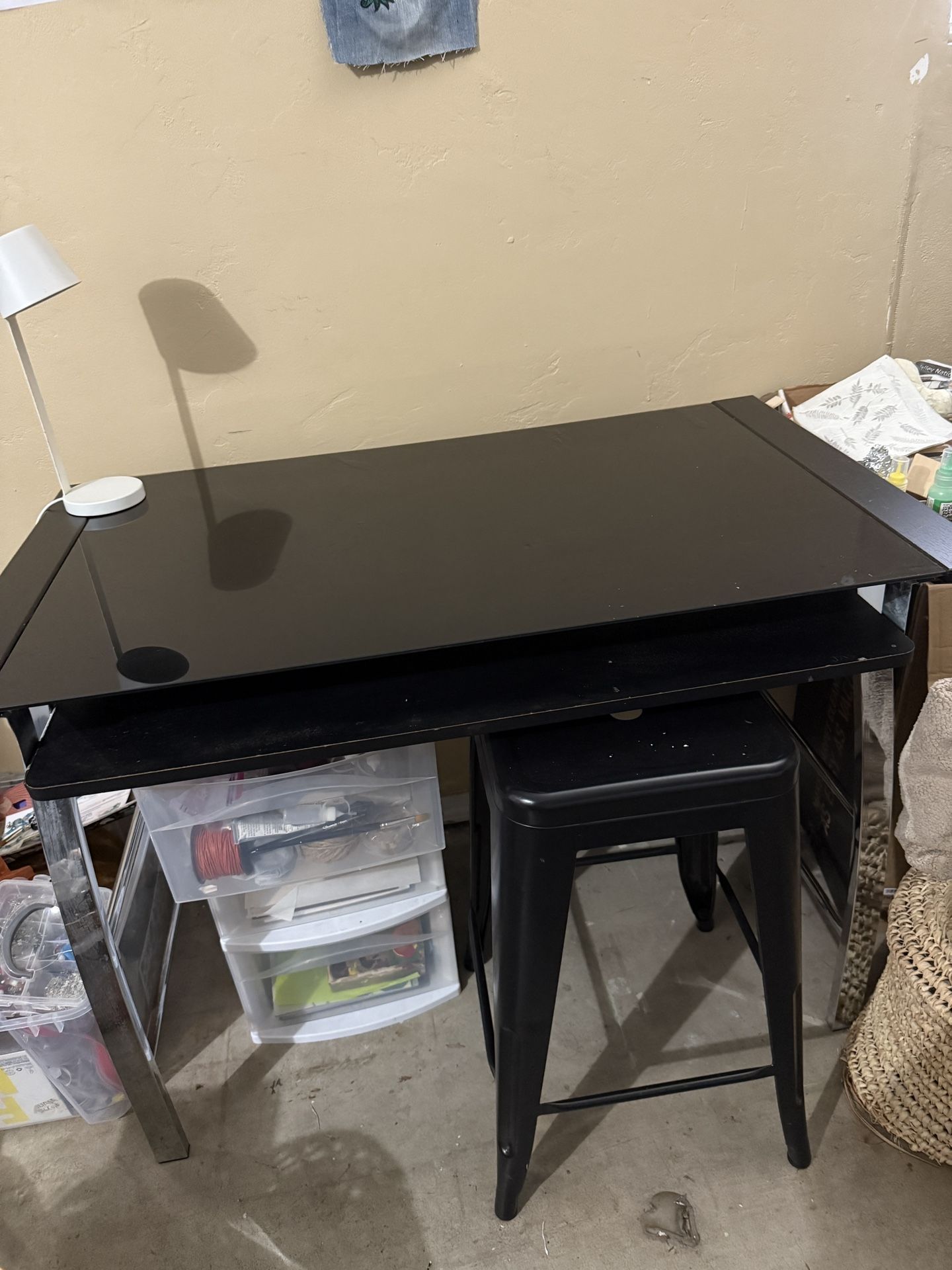 *DESK ONLY* Black glass top table with an extendable wooden shelf 40.5in Lx23.5 in Wx 30in H Black glass and wooden work desk table workshop office furniture