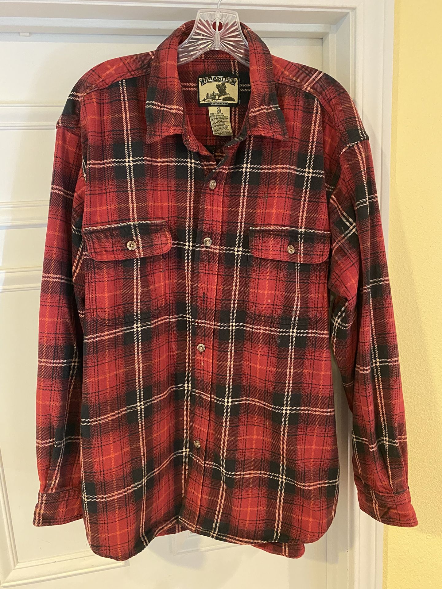 Field & Stream heavyweight cotton flannel shirt. Men’s XL. Red/black plaid. Recently washed, but there are some spots and small holes as pictured. Makes for a great outdoor/work shirt. Measurements: Length 32” Pit to pit 25” Sleeve 22” Meet at Issaquah IHOP. Cash only please.