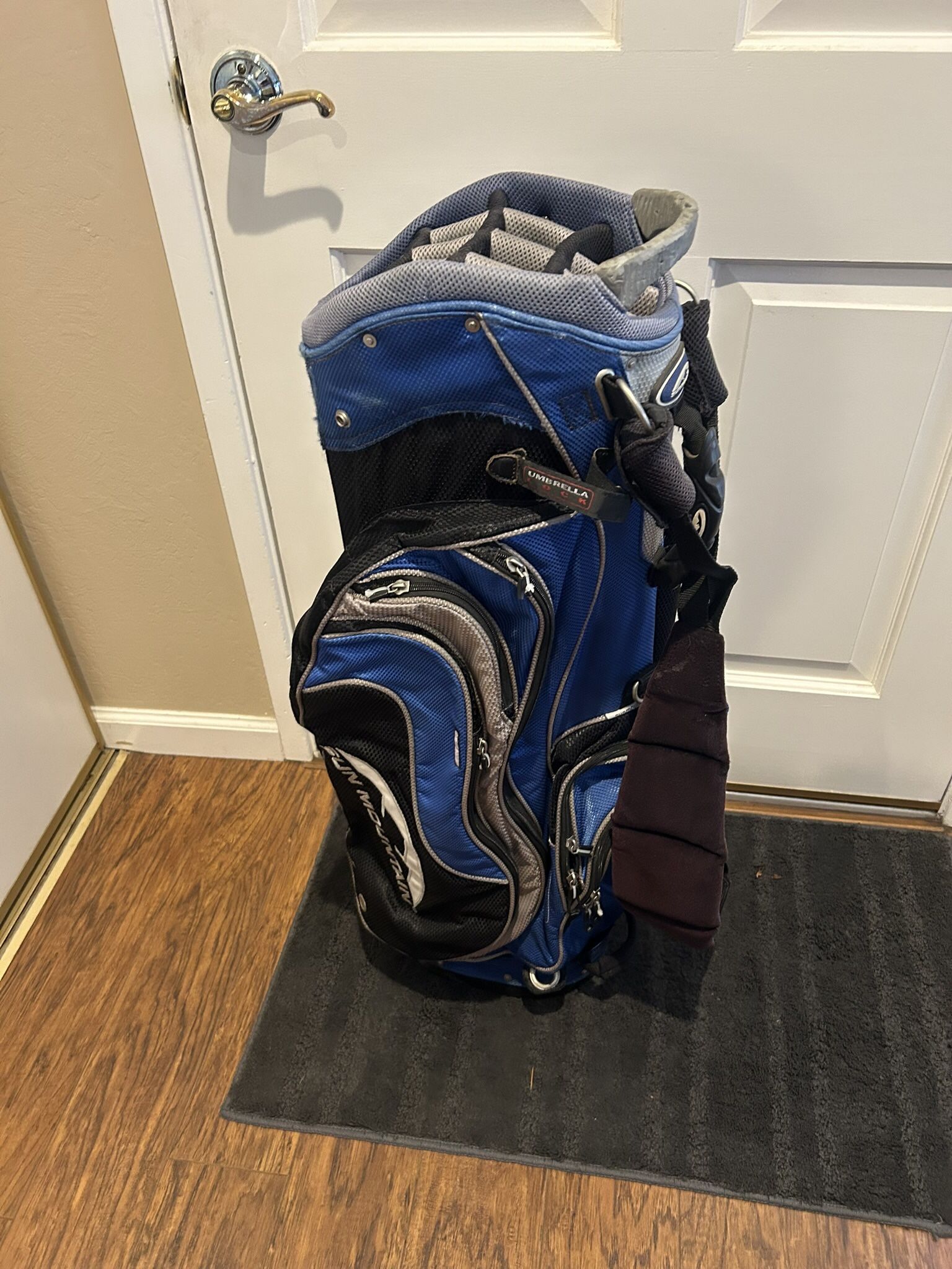 Used in excellent condition. Al the zippers are working and all the pockets are in perfect condition. Sun Mountain Gold Cart Bag.