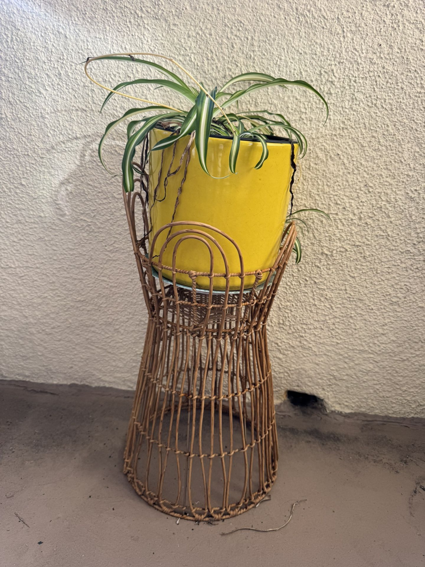Plant in yellow ceramic pot and wicker stand. 26 inches tall by 8 inches wide.