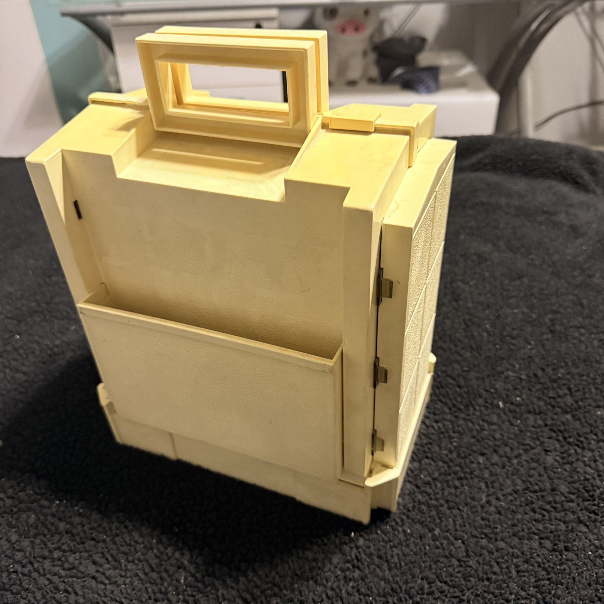 Handy vintage plastic sewing kit. This cool box unfolds to show lots of compartments. Has spools of thread, pins, safety pins, and even some iron-on patches. Beige color. Shows some wear and yellowing from age, a few scuffs on outside.