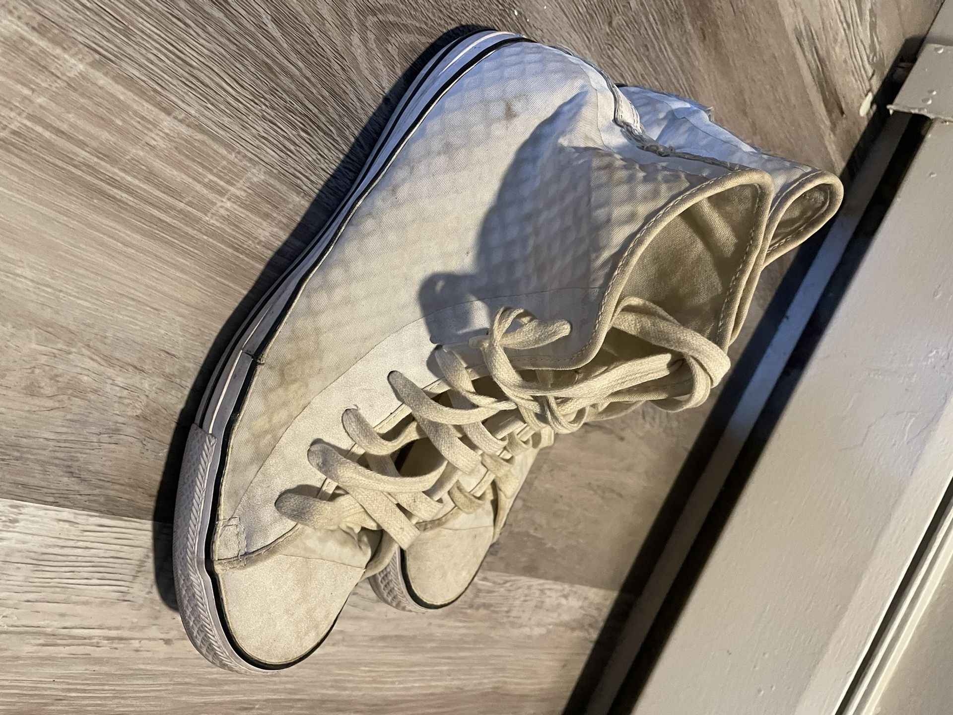Size 12 white converse for sale! Complete with an older and worn look, these are good for walking and rocking that 80’s style wear. Must pickup, $20/obo!