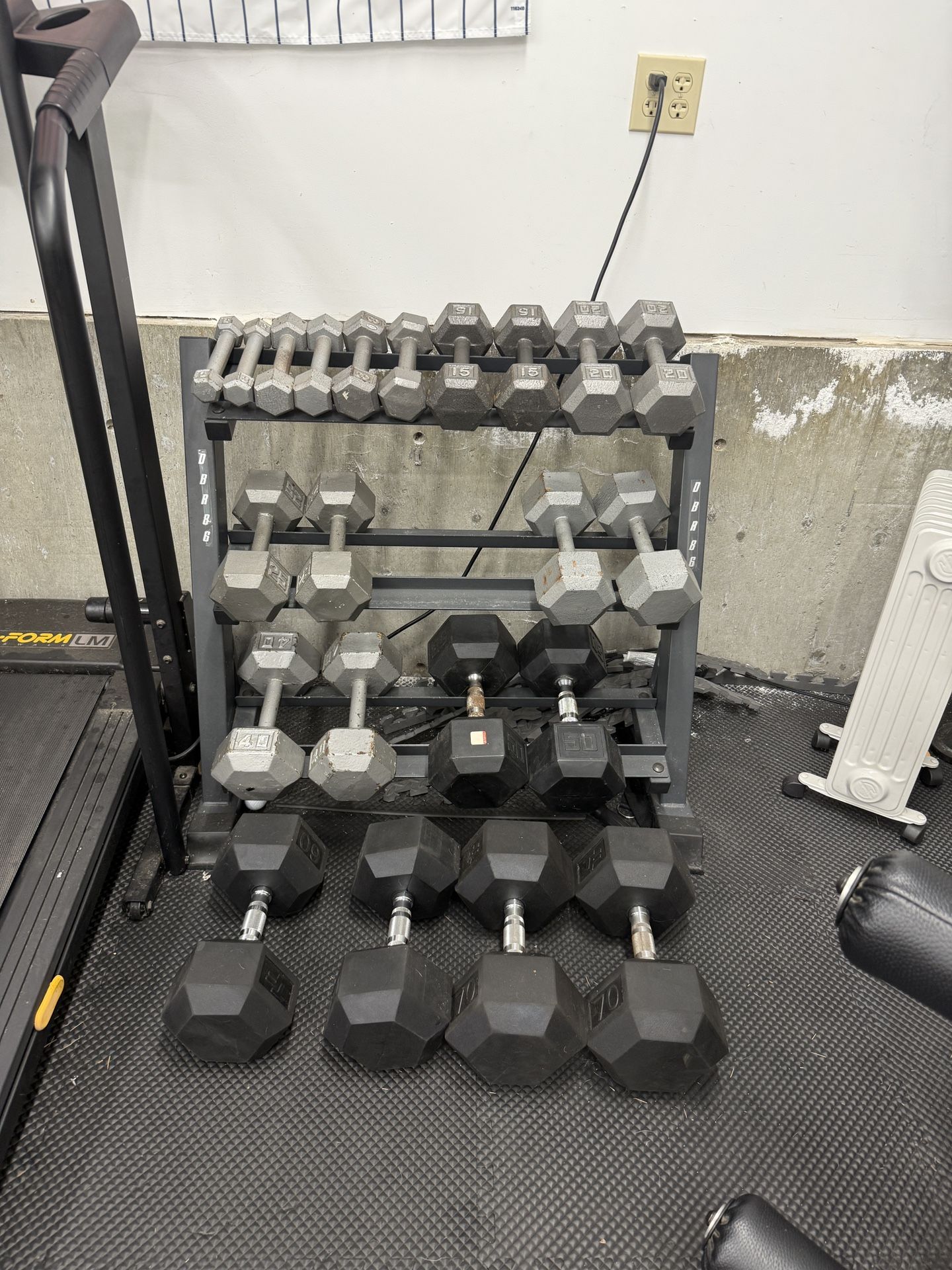 $1/lb Dumbell set with rack, treadmill, bench, squat rack, curl bar, plates etc Dumbbells total 312pounds. pairs of 3,5,8,10,15,20,25,30,40