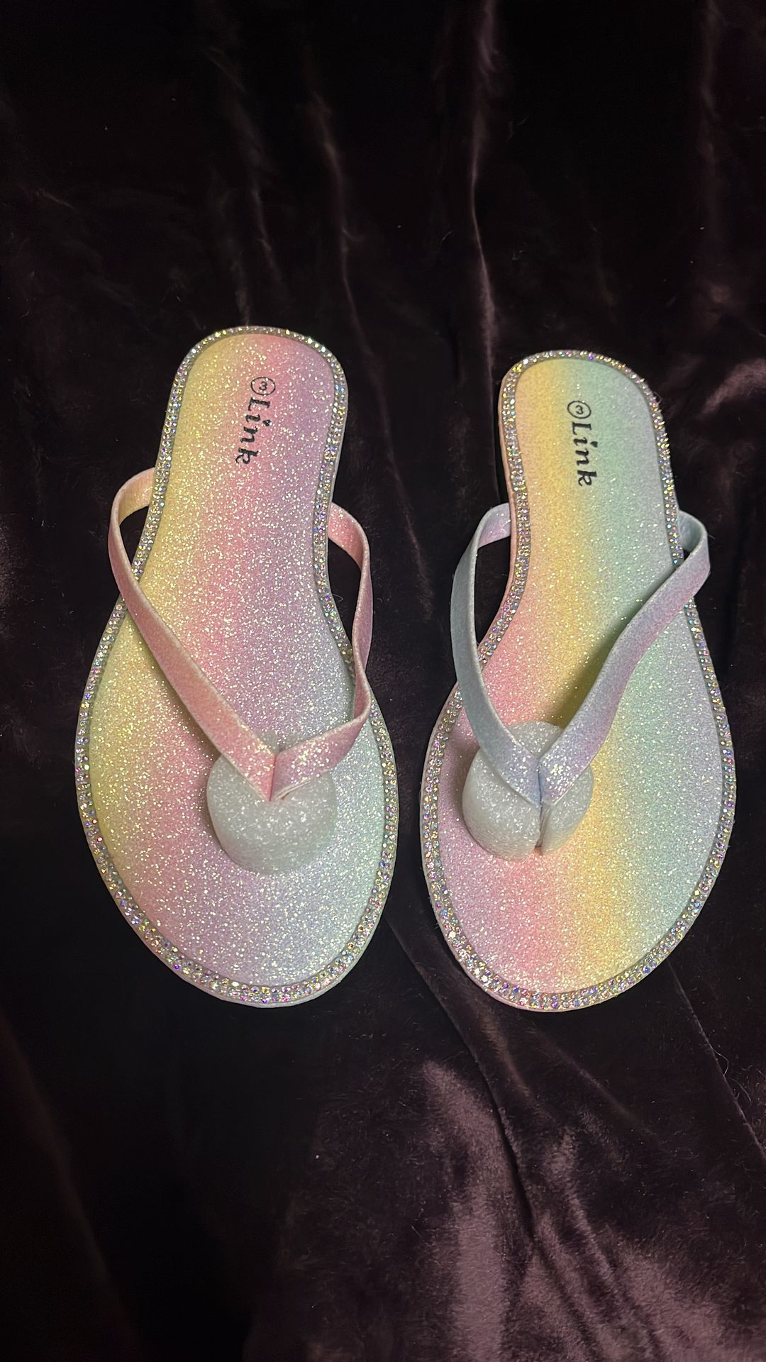 New Link pastel color sandals size 3 , glitter all over very cute with any outfit $10.00 SODA slide sandals black size 4 $10.00