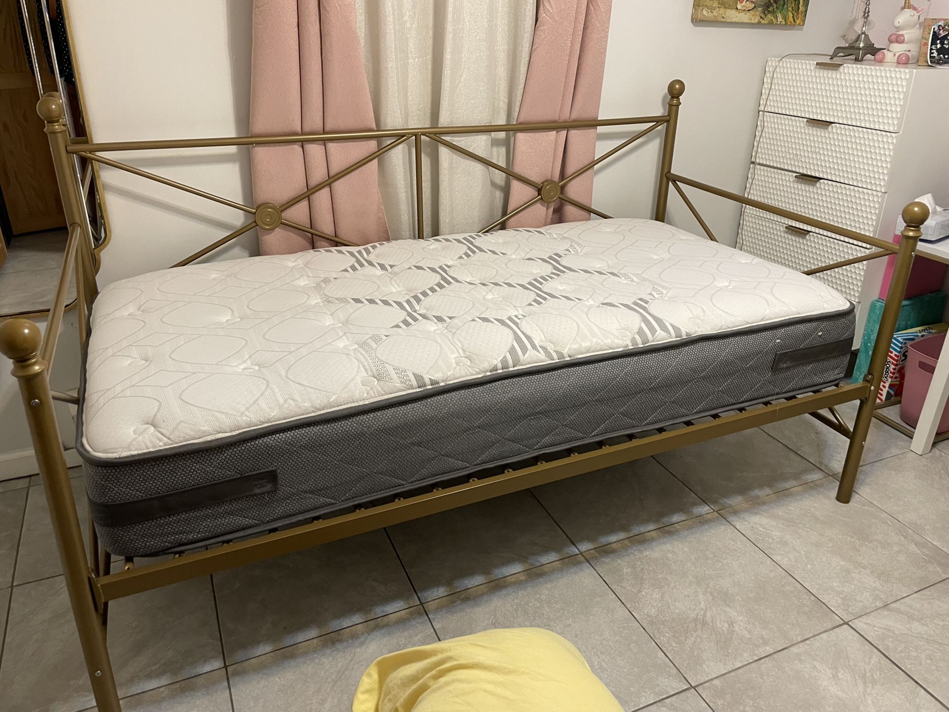 Gold frame twin bedwith West two twin mattress. Modern it’s in mint condition.
