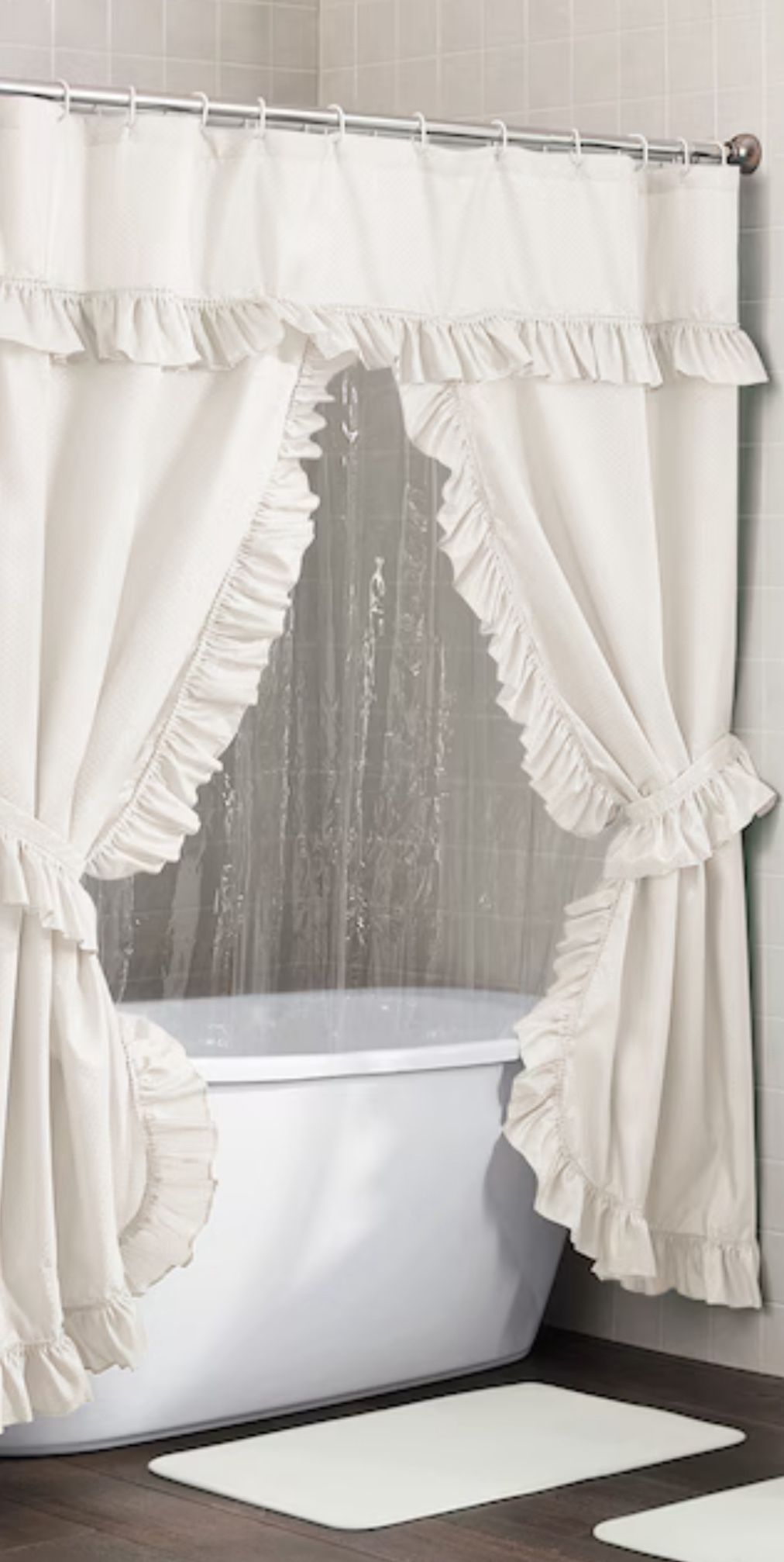 Two sided to create whimsical window frame look. Contains two inner liners and purple fuzzy hook set. Stock photo not exact match. This curtain is actually prettier. High quality materials. Used for staging only.