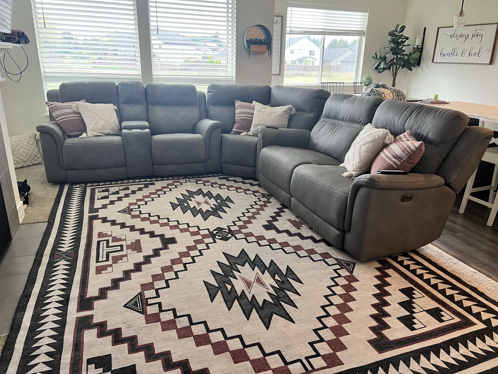 We bought this a few years ago for over $4000. It is a beautiful set and holds up so well if you have kids because of the material is a new futuristic material that is wipeable . We love this set and are sad to see it go but have decided on a different style now . Our loss is your gain only asking $1400 as one of the recliners stopped working, but we were told by Ashley furniture. It should be an easy fix. MEASUREMENTS 134” by 134” Stylish, adaptable and durable. Your living room is the central hub of your home—why settle for anything less? With this power reclining sectional, you can make everyday lounging effortless. A modular design gives you the flexibility to rearrange and refresh your space as you please. Clean up spills with ease thanks to a faux leather that’s as beautiful as it is functional. And when it comes to relaxation, keep your comfort a priority with seamless one-touch reclining and adjustable headrests.