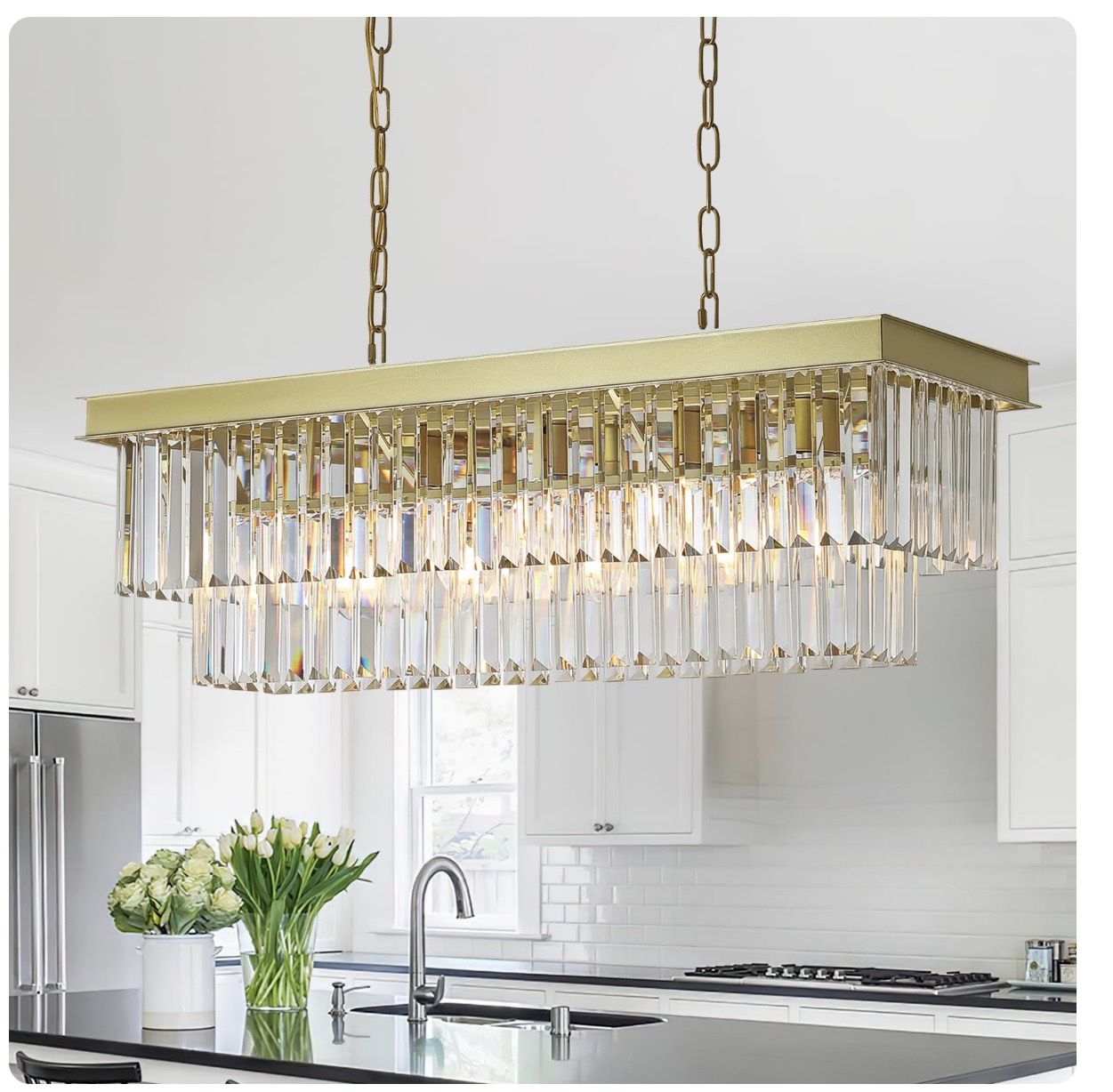 A AXILIXI Rectangular Crystal Chandelier Gold for Dining Room Modern Chandelier Rectangle Linear Pendant Light Fixtures for Kitchen Island L33” K9 Lux