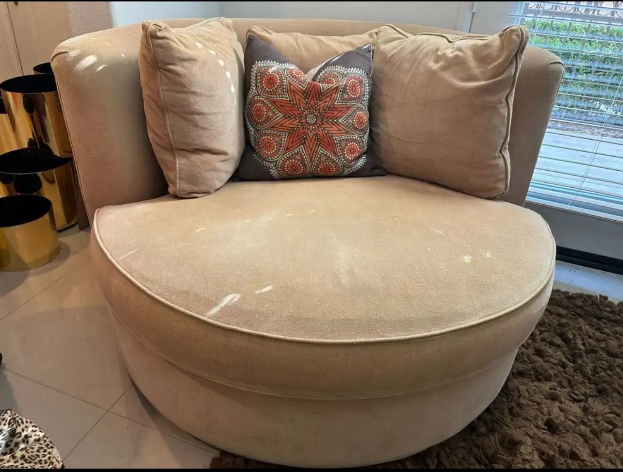Modern. Large. Seats Two! versatile swivel loveseat/large chair with pillows. Beige tan durable fabric. Great condition. Firm. Very well made. 30” tall / 50” wide / 48” deep