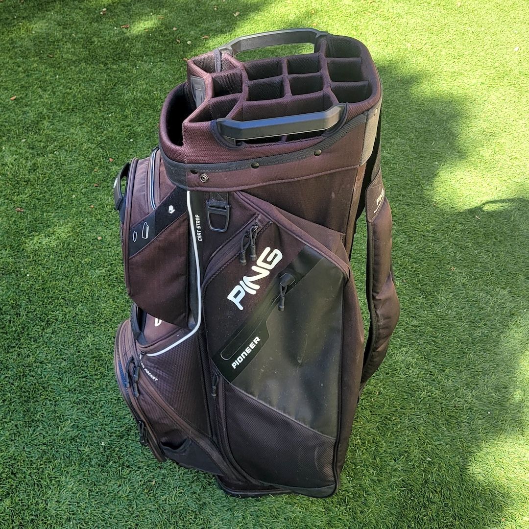 The PING Pioneer cart bag features a 15-way top, multiple pockets, and a durable design for maximum storage and convenience on the course! Includes rain cover. All zippers work smoothly.