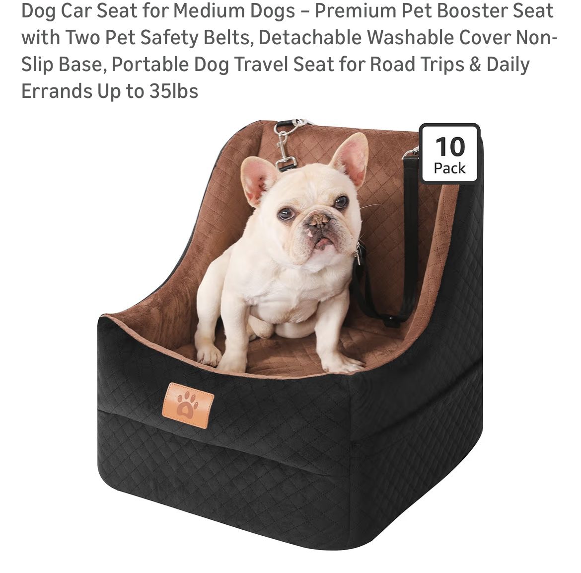 $70 Plush Doggy Car Seat for Small & Medium Dogs. Brand new- still in original wrapping, never used! Black & brown w/ lots of straps & removable cushion. All Amazon details in last photo.